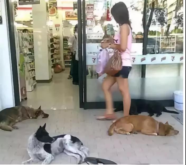 地處熱帶的泰國常年氣候炎熱,在那經??梢钥吹竭@樣的畫面:流浪動物們橫七豎八地躺在超市門口,享受著店內的空氣,一點也不怕人。